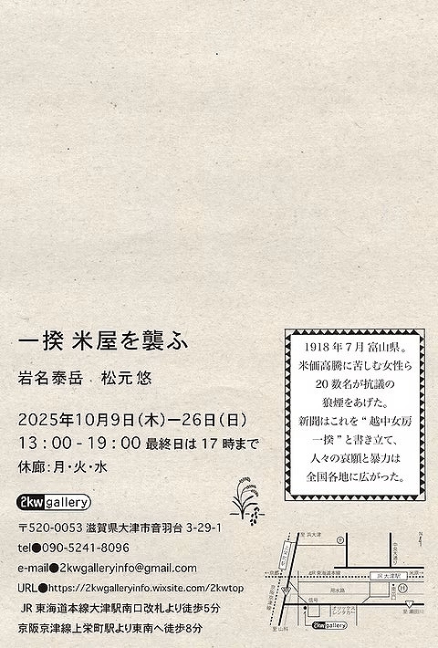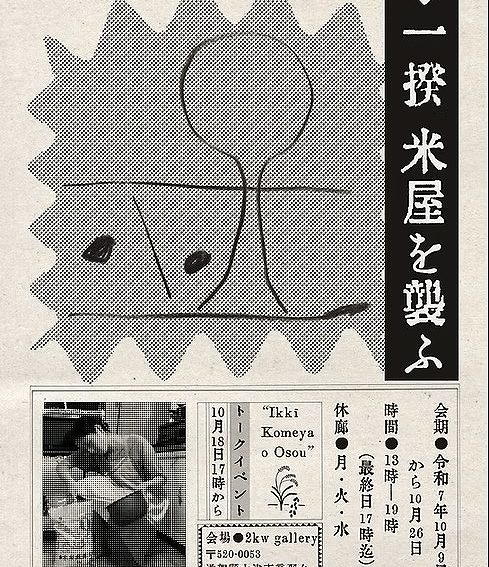 10月9日(木)から10月26日(日)まで、滋賀県大津市の2kwgalleryにて、 岩名泰岳さんと松元悠さんの 二人展「一揆米屋を襲ふ」が開催されます。